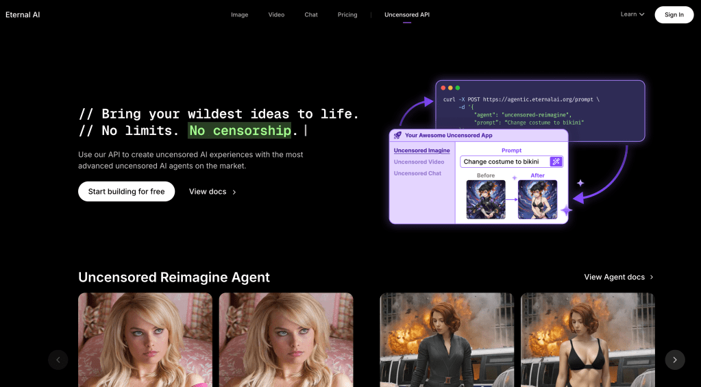 In a digital world dominated by filtered systems and restricted models, Eternal AI stands for creative independence. With its free uncensored AI image editor, Agentic API, and unlimited AI foundation, the platform allows creators to work faster, smarter, and without censorship.